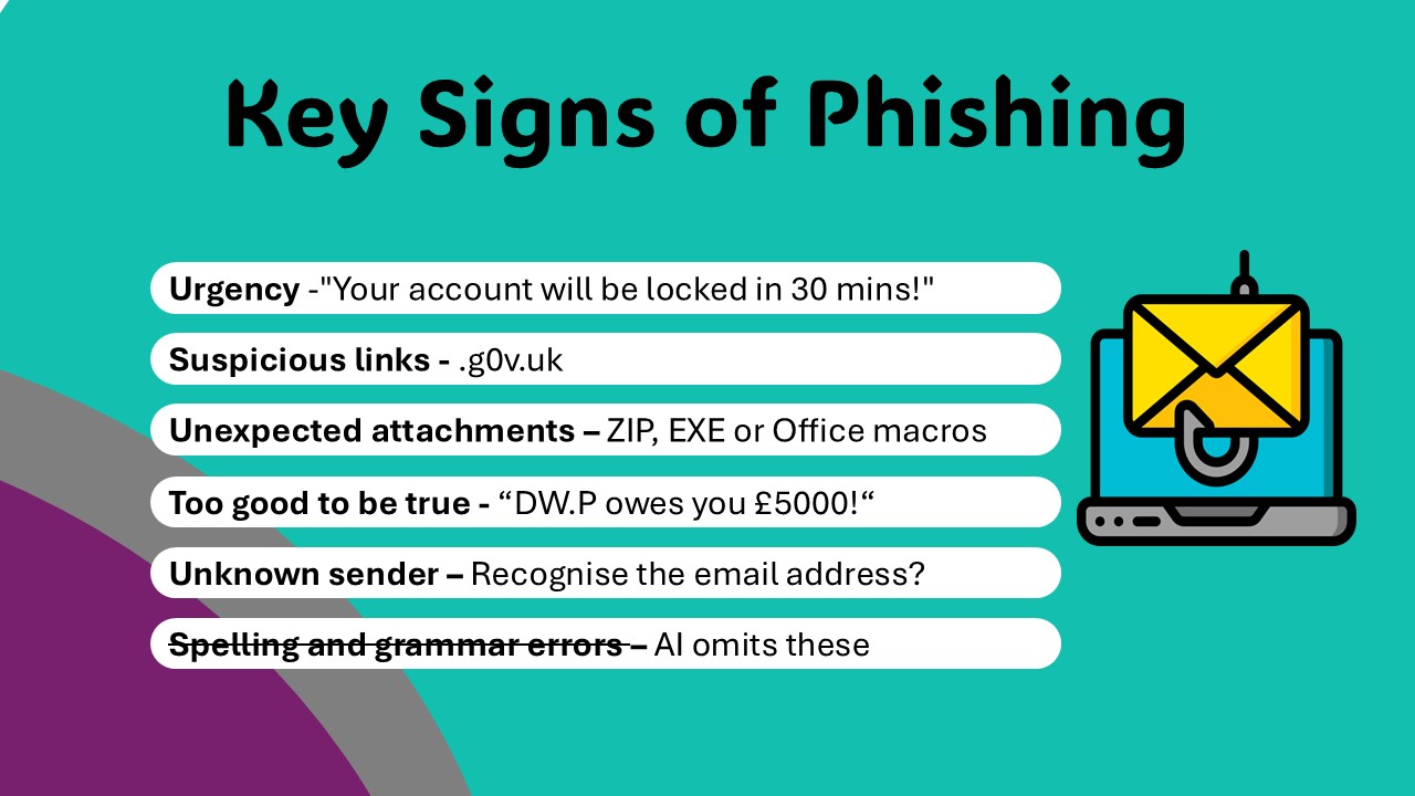 We learned that good cyber security training isn’t about fear, it’s about empowerment. People want to know why security matters to them personally, not just what policies to follow. So, we made sure to include tips that people can apply for their own use. For example, although phishing emails are getting more sophisticated and harder to detect due to generative AI, the usual red flags are still there: